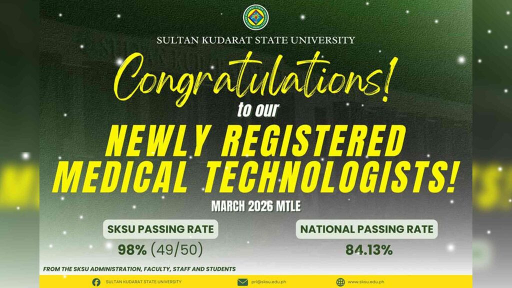 The Sultan Kudarat State University (SKSU) proudly congratulates our newly registered Medical Technologists for their outstanding performance in the March 2026 Medical Technologist Licensure Examination.