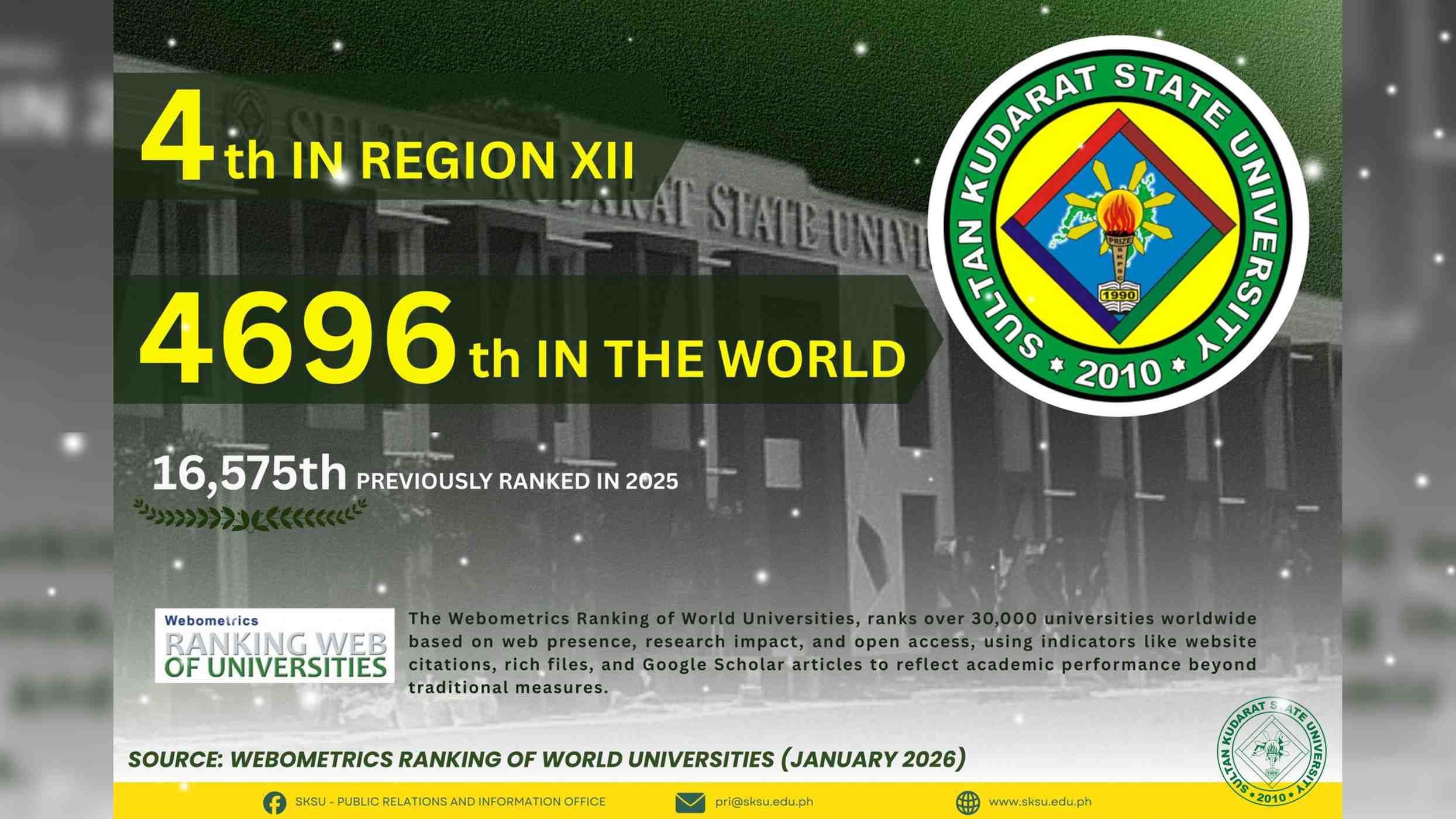 Sultan Kudarat State University (SKSU) showed a substantial improvement in its global position in the January 2026 Webometrics Ranking of World Universities. The university achieved a worldwide ranking of 4,696th, marking a significant rise from its previous global rank of …